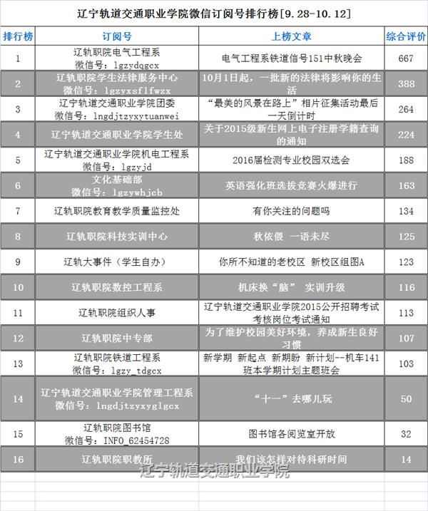 自2015年9月14日起,辽宁轨道交通职业学院每周一推出全院微信订阅号排行榜。本榜单推出后,在全院各部门中引起很大关注,也收到很多反馈,在此我们表示感谢!