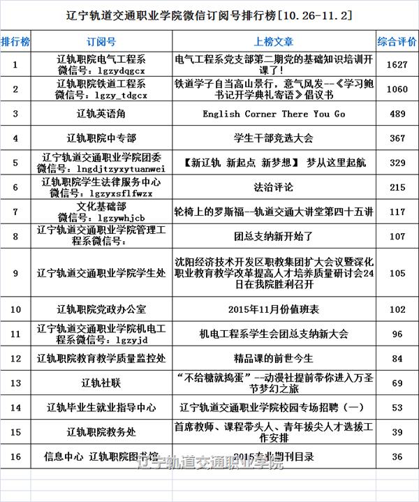 自2015年9月14日起,辽宁轨道交通职业学院每周一推出全院微信订阅号排行榜。本榜单推出后,在全院各部门中引起很大关注,也收到很多反馈,在此我们表示感谢!