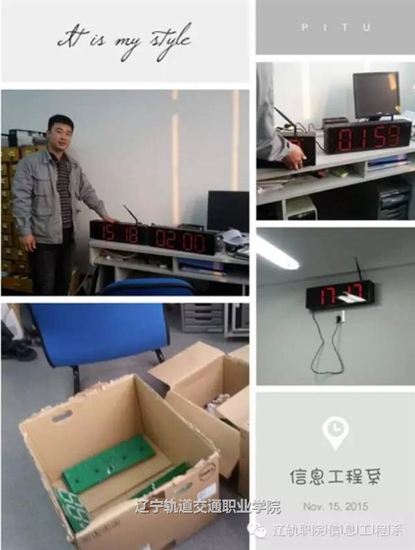 音乐和时间显示都来自于电子钟,这是学院信息工程系主任王磊、教师王雪自主研发的成果。这是一个智能型钟表,外观简洁大方,只要连接电源都会自动更新到当前准确的北京时间。各教室的电子钟安装工作全部由信息工程系教师带领13级学生完成。