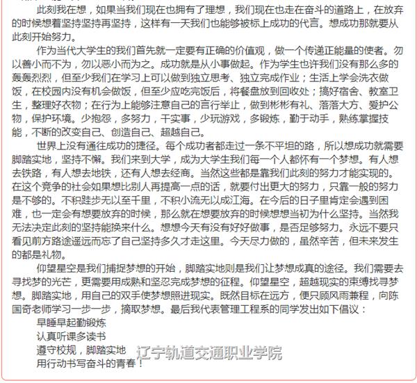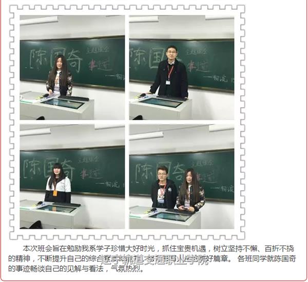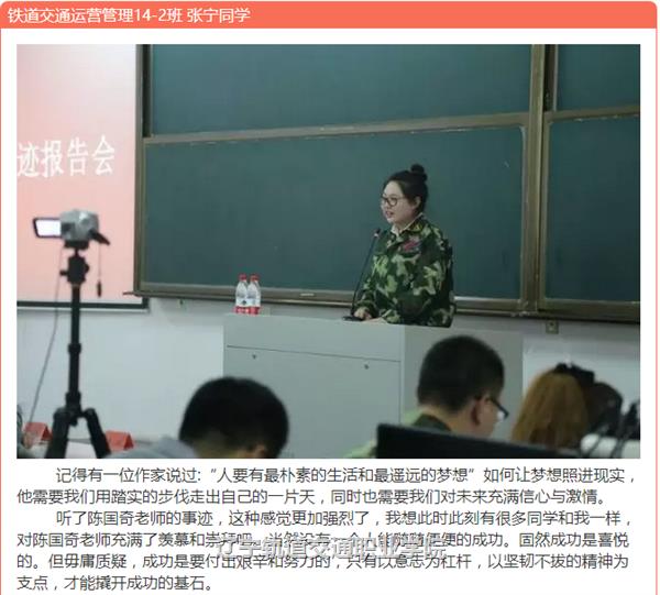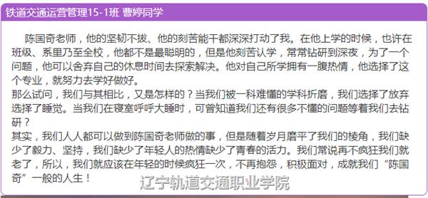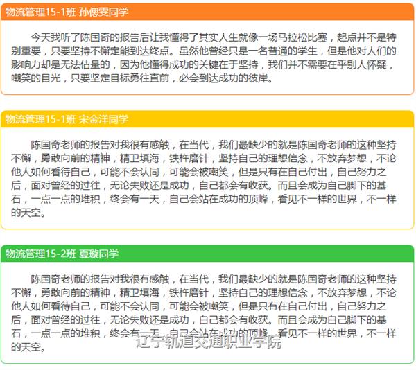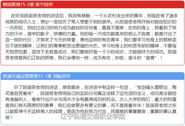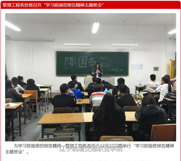 2015年12月22日,辽宁轨道交通职业学院召开了陈国奇先进事迹报告会。报告会后,全院各系迅速组织开展了形式多样的学习动员活动,引领广大青年学子将学习陈国奇落在行动上,鼓励青年学子早日成长为社会栋梁之材。