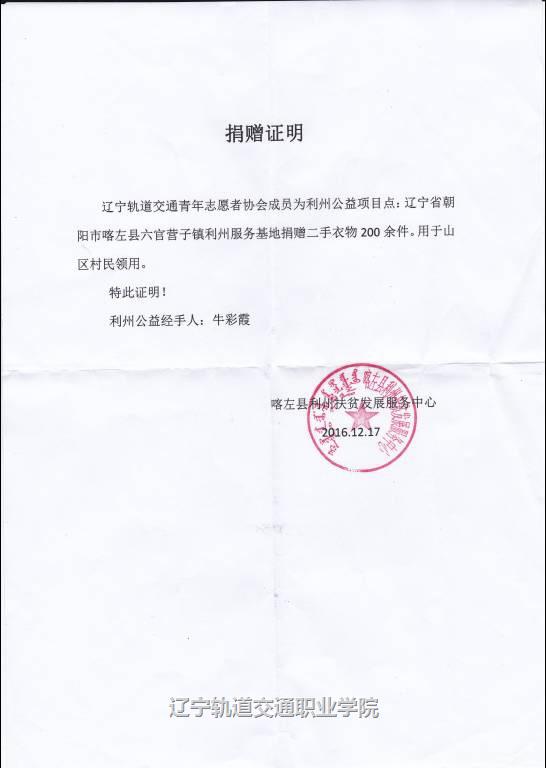 2016年11月24日到25日,辽宁轨道交通职业学院青年志愿者协会在院内开展了“旧衣重燃,衣旧暖心”活动,号召师生们将多余的衣物捐赠给那些贫困地区的人们,为真正需要的人贡献出自己的一份爱心。