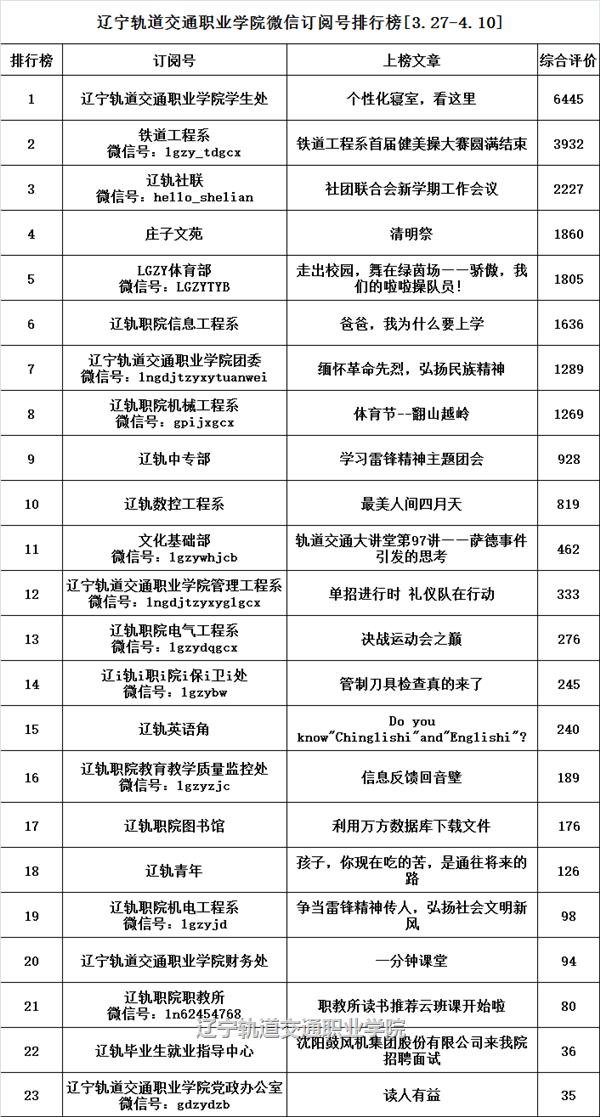 辽宁轨道交通职业学院微信订阅号排行榜样[3.27--4.10]